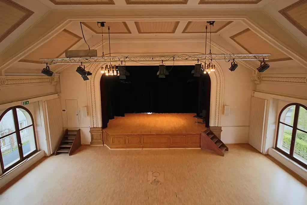 La salle de spectacle compte environ 300 places. Elle possède des chaises, 25 tables, une scène, une sono, un éclairage de base, une buvette simple avec arrivée d'eau uniquement.